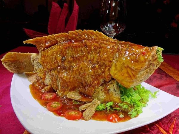 Thật là hấp dẫn khi thưởng thức Cá Mú chiên giòn : đuôi cá và da cá giòn từ lớp ngoài - thịt cá săn và chắc từ bên trong